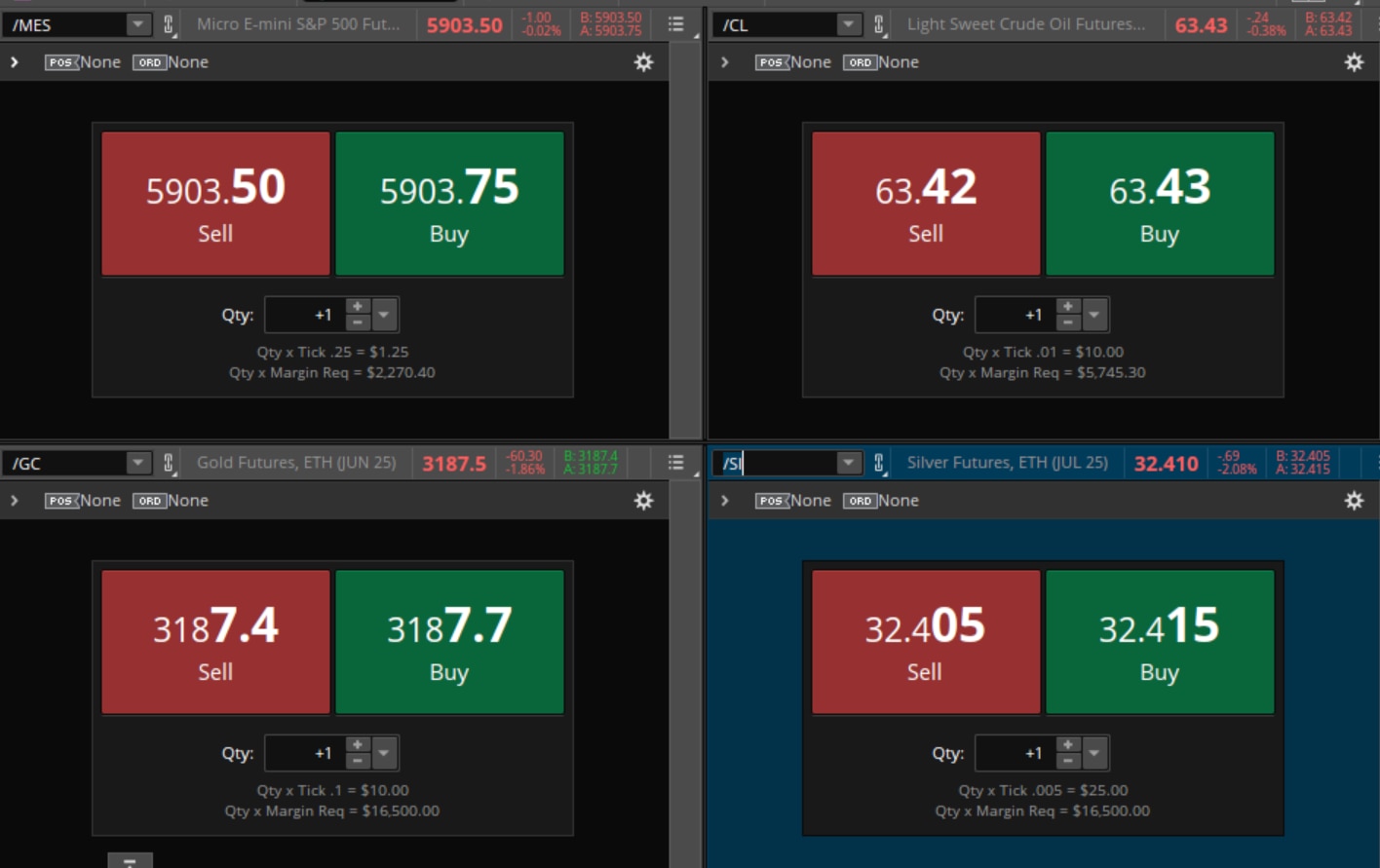 To trade futures on the thinkorswim platform, select the Trade tab, then Futures Trader. Several dashboards and charts appear. In the symbol box, enter a symbol, such as /MES for Micro E-mini S&P futures. The quote box displays the bid (sell) and ask (buy) price. Select the contract to enter an order.